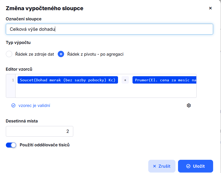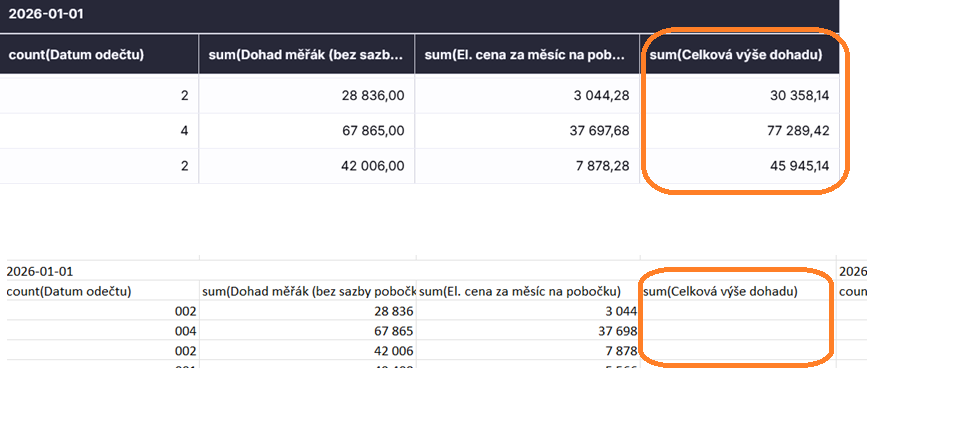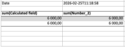 In my pivot I have one sum field (sums values Dohad měřák), one average field (pevna cena na pobočku) and one calculated as sum of sum(Dohad měřák) and avg(pevna cena na pobočku). “Plain” sums are ok, and I can see them in excel export but not the last field which is a sum of sum and avg column.