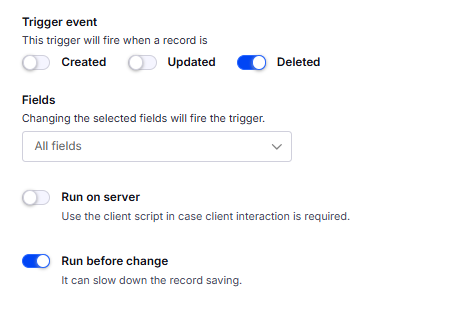 In the table, I am using the system field Created By. In the permission role, delete access is enabled for this table, and I have added the condition: doo.model.createdBy === doo.currentUser.login`