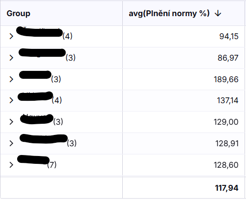 The problem is, as you can see, when I sort by avg(Plnění normy %) there are few rows which should not be there on top. I made sure that Plnění normy is type Number and is not empty in any record. Interesting fact is that it keeps happening only for rows where avg(Plnění normy %) < 100. That would indicate that it is working with it as type Text. Why is it happening when Plnění normy is Number?